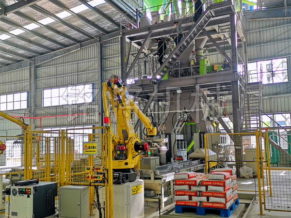 整套膩子粉生產線占地面積200㎡,設備高度9m,用電功率約100kw,人員配置(單班)2-3人。每小時產量10-30噸可調。整套設備由高效混合生產線、自動包裝生產線、智能化輸送線、自動碼垛線四大部分構成。