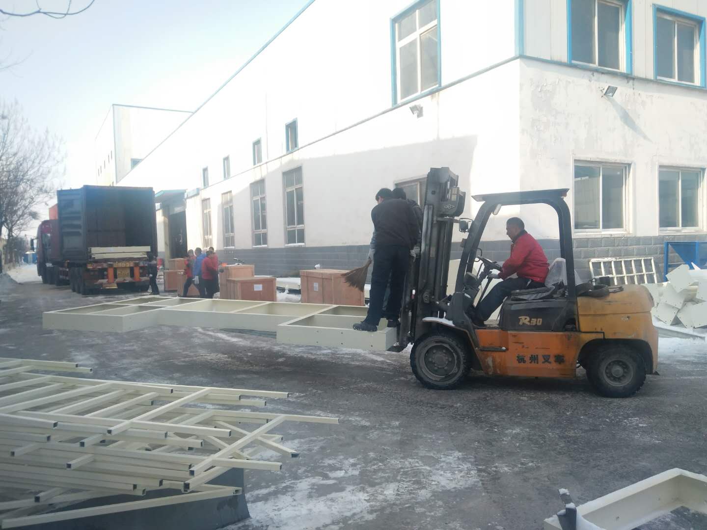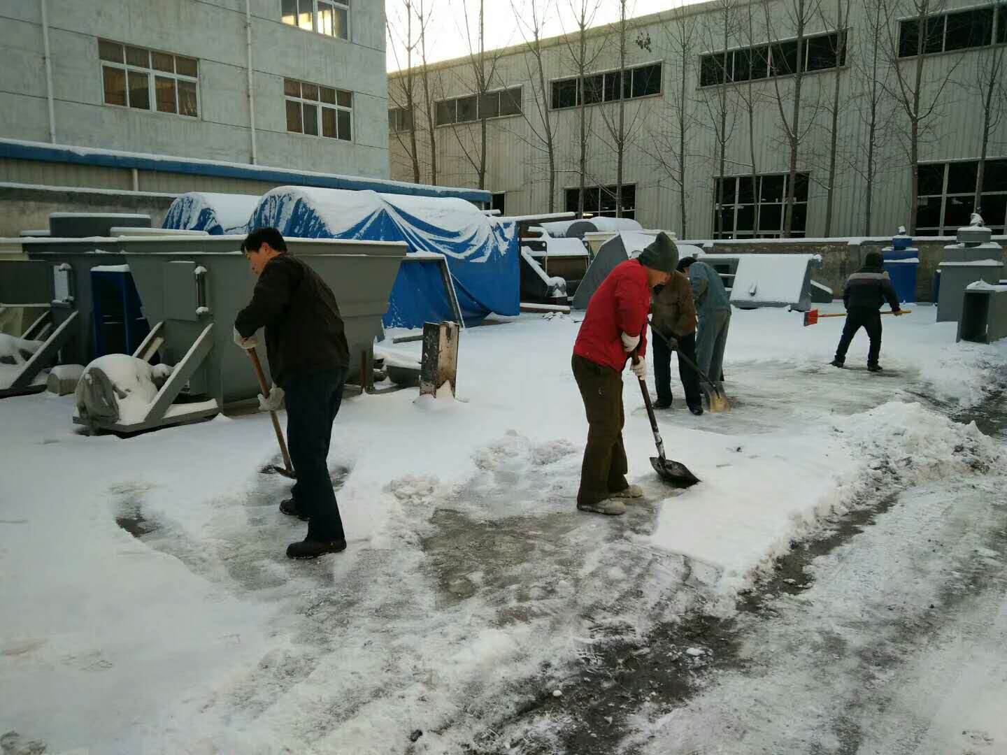 這場雪持續一天一夜,整裝待發的設備上蓋著厚厚的一層雪,為了不耽誤客戶的工期,正常發貨,一大清早銘將全體員工集體出動,清掃設備上的雪,大家不怕嚴寒,始終飽含工作熱情和高昂的斗志,有力的為塞爾維亞的正常發貨做好準備。